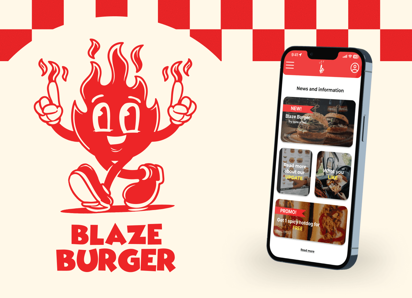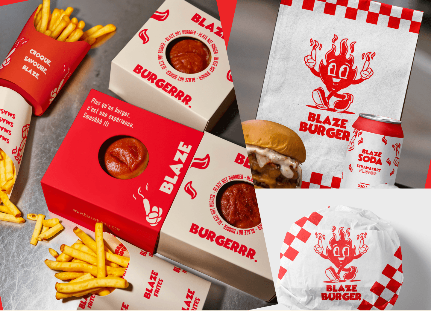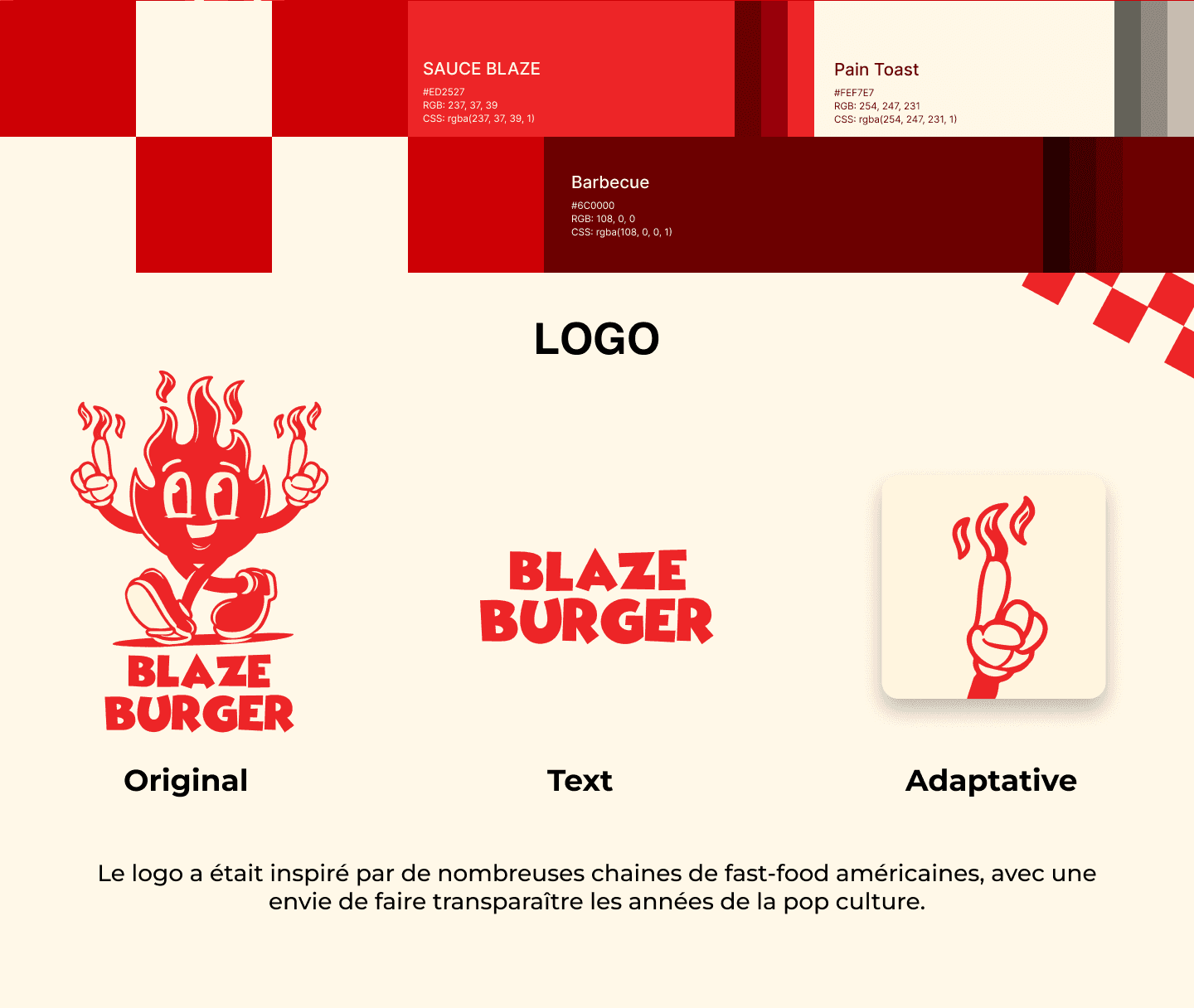 Blaze Burger est un fastfoods inspiré des 80's. J'ai voulu représenter cette époque au travers de toute la DA (juste après avoir vu stranger things qui m'a rendu nostalgique d'une époque que je n'ai même pas connu). J'ai alors crée une mascotte - Blaze - ainsi qu'un logo typographique sur Illustrator, toujours dans ce ton 80's comics, et j'ai ensuite créer le prototype de l'application sur Figma.